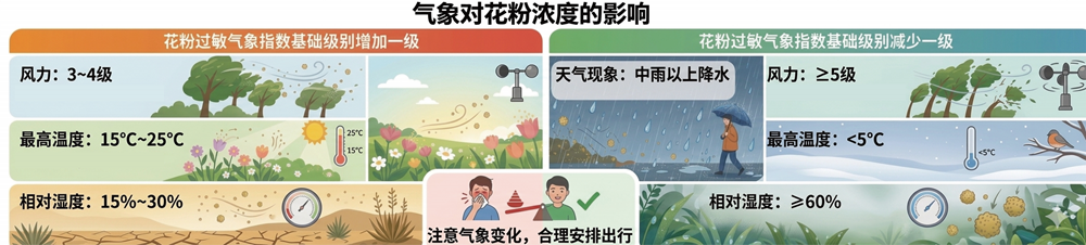 花粉和柳絮的传播离不开景观要求,温度、晴雨、风力等皆会影响花粉浓度和传播边界,过敏进度也会产生波动。