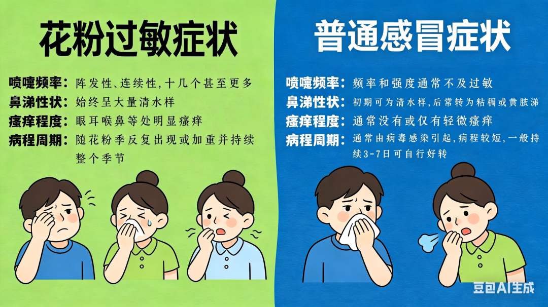 春季不仅是过敏季,亦然伤风高发期。对花粉过敏和伤风的症状稠浊是春天的一大侵略,稠浊颐养不仅不见疗效,也容易逗留防护时机。以下几点支持判断: