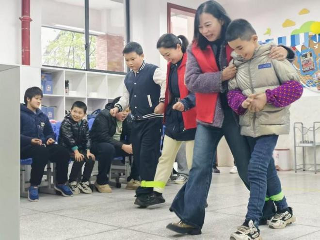 志愿者孙浪、赵春划分半搂着结对的孩子,用绑带轻轻系好两东谈主的脚踝。从起初的跌跌撞撞、步伐蹒跚,到自后都声喊着“一二、一二”的标语,脚步同频、并肩上前。冲过至极的那一刻,孩子们清翠的笑声,在活动室里久久飘扬。