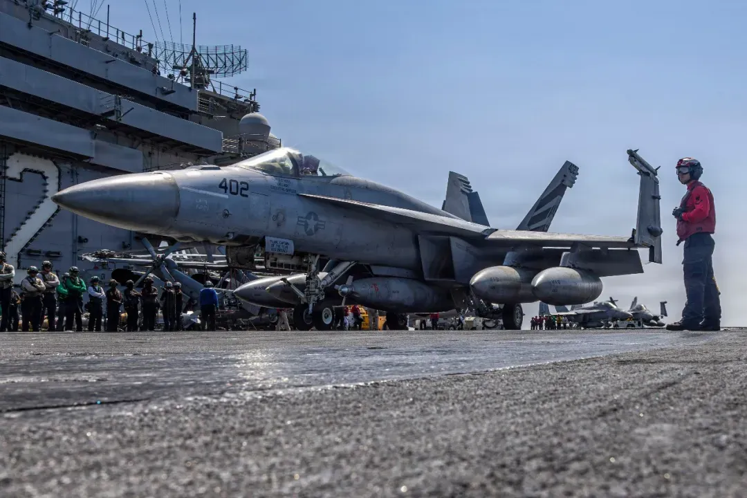 3月2日,好意思国“林肯”号航空母舰飘零船面上的一架F/A-18E“超等大黄蜂”战斗机。新华社/好意思联