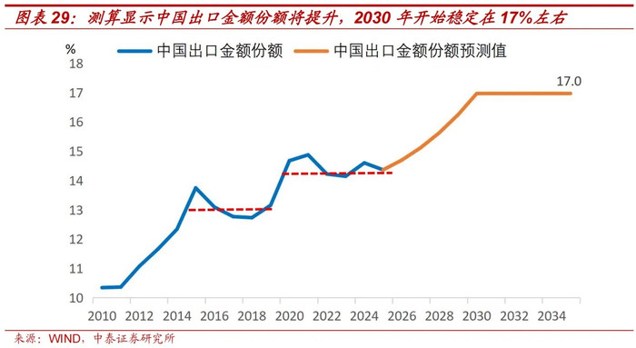 把柄上述假定,不错计算出2026年到2030年中国出口金额份额的同比。2025年中国出口金额份额为14.4%,进一步不错计算出2026年到2030年的中国出口金额份额,隔离为14.7%、15.1%、15.6%、16.2%和17.0%,之后进入一个新的稳态。