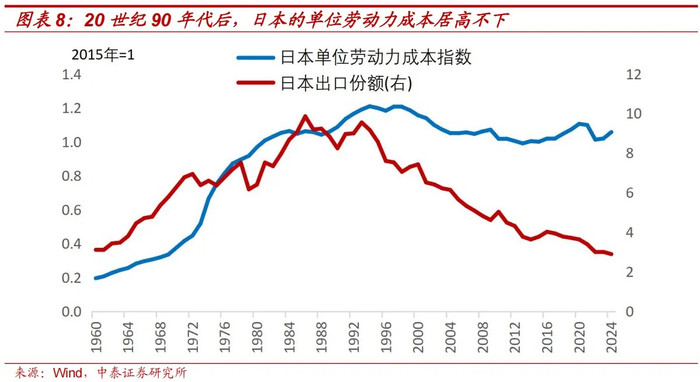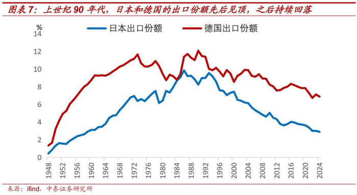 咱们以为,日本和德国的出口份额触顶后握续下滑,有以下三个共性原因。
