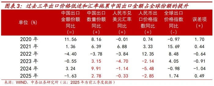 通过拆解可发现,2023年到2025年中国出口数目份额是握续提高的,但由于东谈主民币汇率贬值和中国出口价钱指数走弱,导致中国出口金额占公共的份额未能冲突2021年高点。