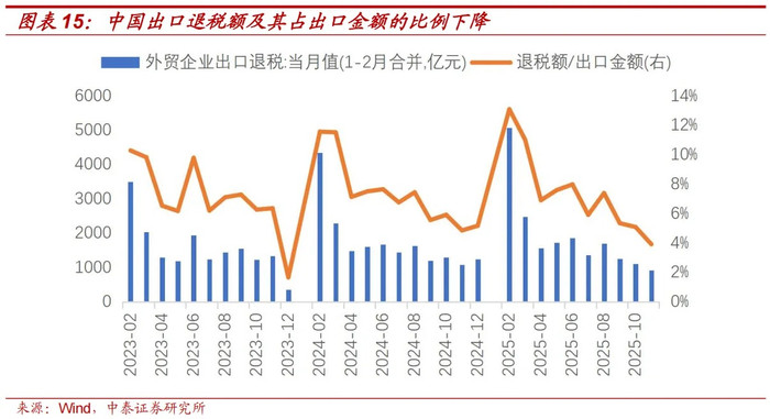 2022-2024年外贸企业出口退税占出口金额比重隔离为6.88%、7.20%、7.58%,2025年前11个月占比回落到7.05%。