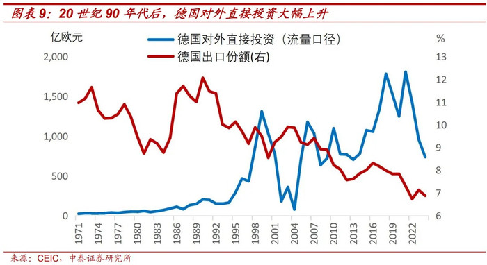 而日本企业“出海”则是面对《广场合同》后日元增值和“自发出口截至”等商业摩擦的不得已为之,这种被迫的、大畛域的外迁,与国内新的高新工夫产业发展滞后形成了断层,最终导致日本“产业空腹化”。这亦然为何日本出口份额在达到峰值后,比德国出口份额下滑更快和更久的原因之一。