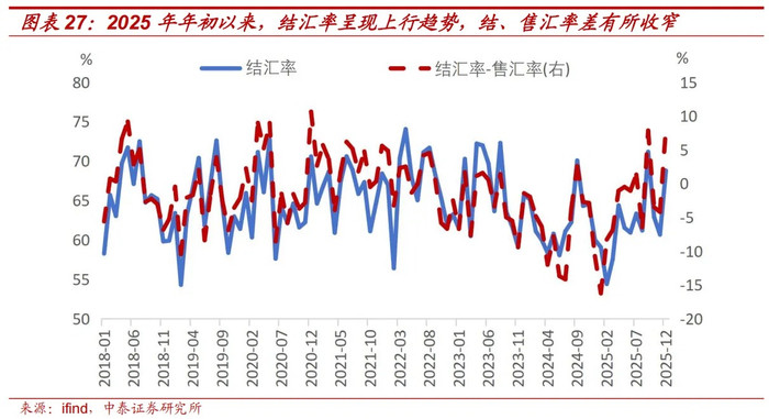 从境内主体的角度看,昔日两年多握续有收汇顺差,增值可能推升结汇意愿。咱们测算闪现,2022年到2025年,出口企业爽脆积蓄了9600亿好意思元的“待结汇盘”。2025年年头开动,跟着好意思元走弱、东谈主民币职权金钱阐发亮眼,结汇率和结售汇率差齐闪现中国出口企业的结汇意愿提高。要是东谈主民币进一步增值,有望和企业结汇形成良性轮回。