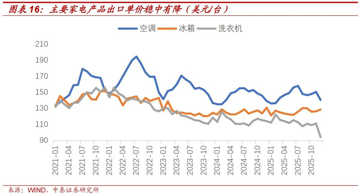 以竞争相对充分的家电企业为例。比年来,空调、雪柜、洗衣机的出口商品单价总体有所下降,已隔离从2022年的167.7、142.2、139.9好意思元/台下降至2025年的145.3、125.6、110.8好意思元/台。