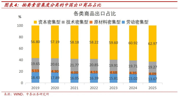 把柄要素密集度,对出口商品进行归类,可分为原材料密集型、工作密集型、工夫密集型和成本密集型四类。不错看到2019年到2025年,中国工作密集型和原材料密集型的商品出口占比,隔离从18.43%、5.13%,下降到13.67%和4.09%。这几年中国工夫密集型商品出口占比褂讪在20%傍边,而成本密集型商品出口占比,从2019年的56.80%,快速提高至2025年的62.97%。