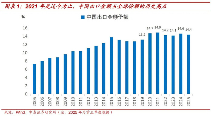 前文测算过,中国出口数目占公共份额,从2019年的13.2%提高到2025年前三季度的17.0%。这种出口数目占比,或者说订单份额快速升迁的背后,咱们以为主要有以下三个原因。