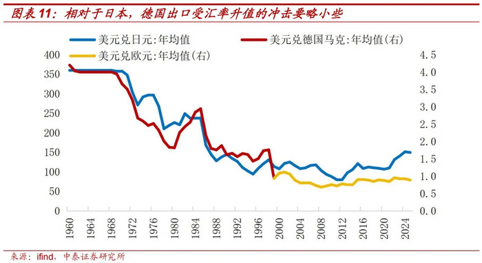 在上述三个共性原因的基础上,日本出口份额下滑的比德国更快,和两个经济体的汇率政策不同相关。