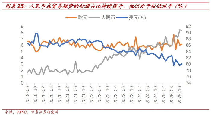 2022年以来,诚然东谈主民币在国际商业融资和支付中的占比握续上升,但面前依然跟中国的经济和商业实力不匹配。把柄SWIFT数据,2025年11月东谈主民币商业融资占比8.36%,远低于好意思元的80.15%。