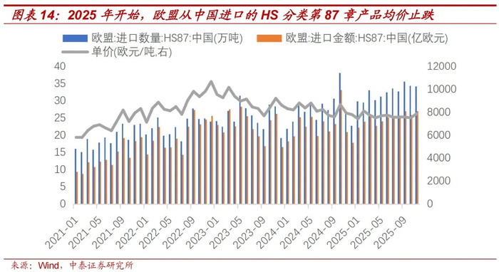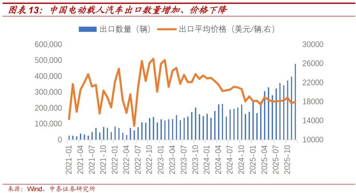 这里咱们以载东谈主电动汽车为例。2023年开动,中国对欧盟出口汽车的价钱下降,2023年中国出口载东谈主电动车的平均价钱为2.36万好意思元/辆,2024年、2025年隔离下降至2.09万好意思元、1.82万好意思元。