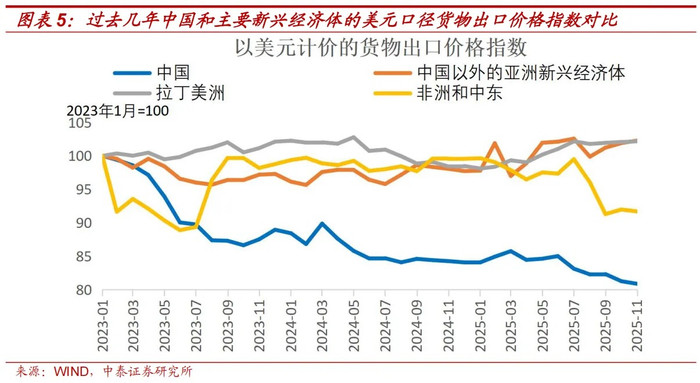 中国和其它主要新兴市集的好意思元口径出口价钱指数之间的对比,更能反应中国出口企业“以价换量”行为。2023年1月到2025年11月,中国货品出口价钱指数下降19.1%,而同期非洲和中东、拉丁好意思洲、中国除外的亚洲新兴经济体的货品出口价钱指数,隔离下落8.3%、上升2.2%和上升2.3%。