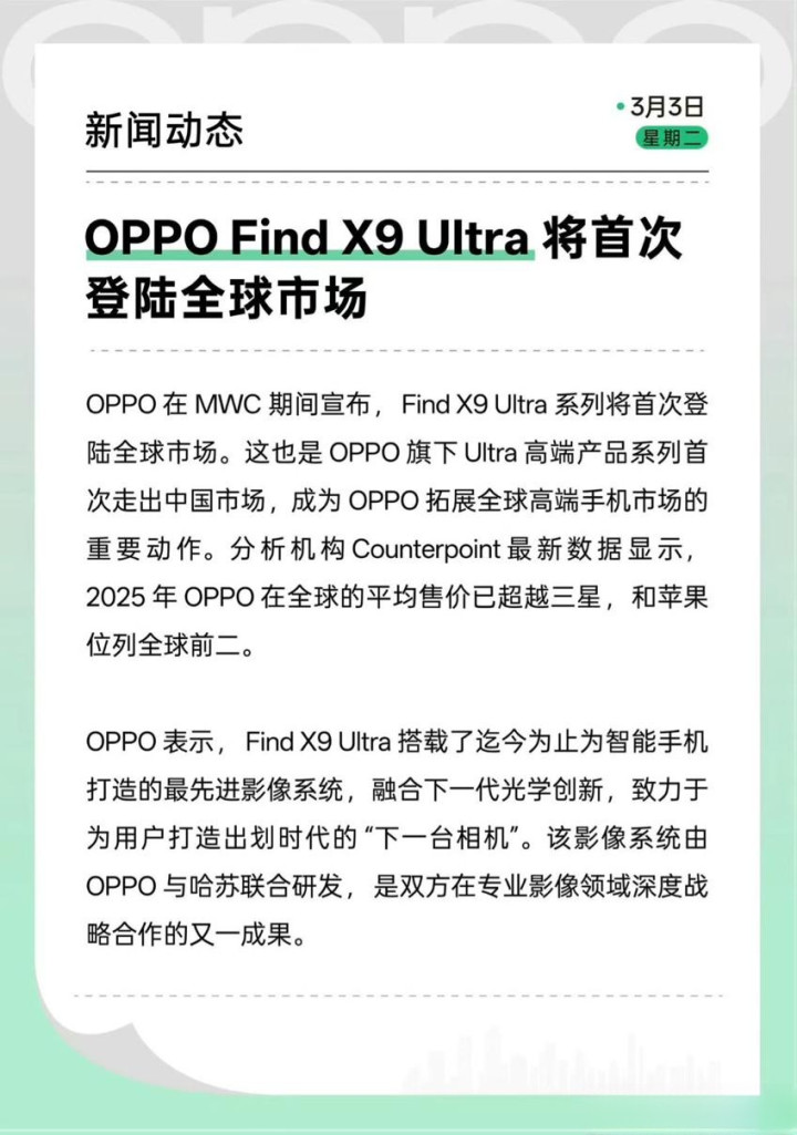 在MWC 2026大会上,OPPO倏得官宣旗下Find X9 Ultra将初次登陆人人阛阓,这不仅是黑厂超大杯旗舰的初次人人亮相,更是国产高端手机向人人顶级阵营发起的正面挑战。这款被定位为“下一台相机”的新机,到底能否梗阻国外用户对国产高端的固有印象?